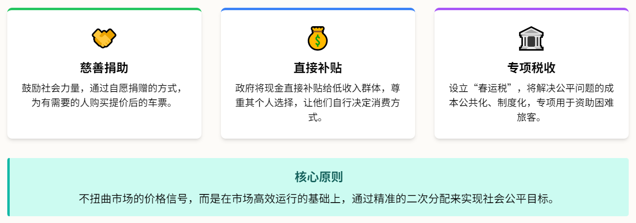 市场化提价能最高效地分配资源,但如何保障低收入群体的返乡权利?用价格解决效率问题,用二次分配解决公平问题。